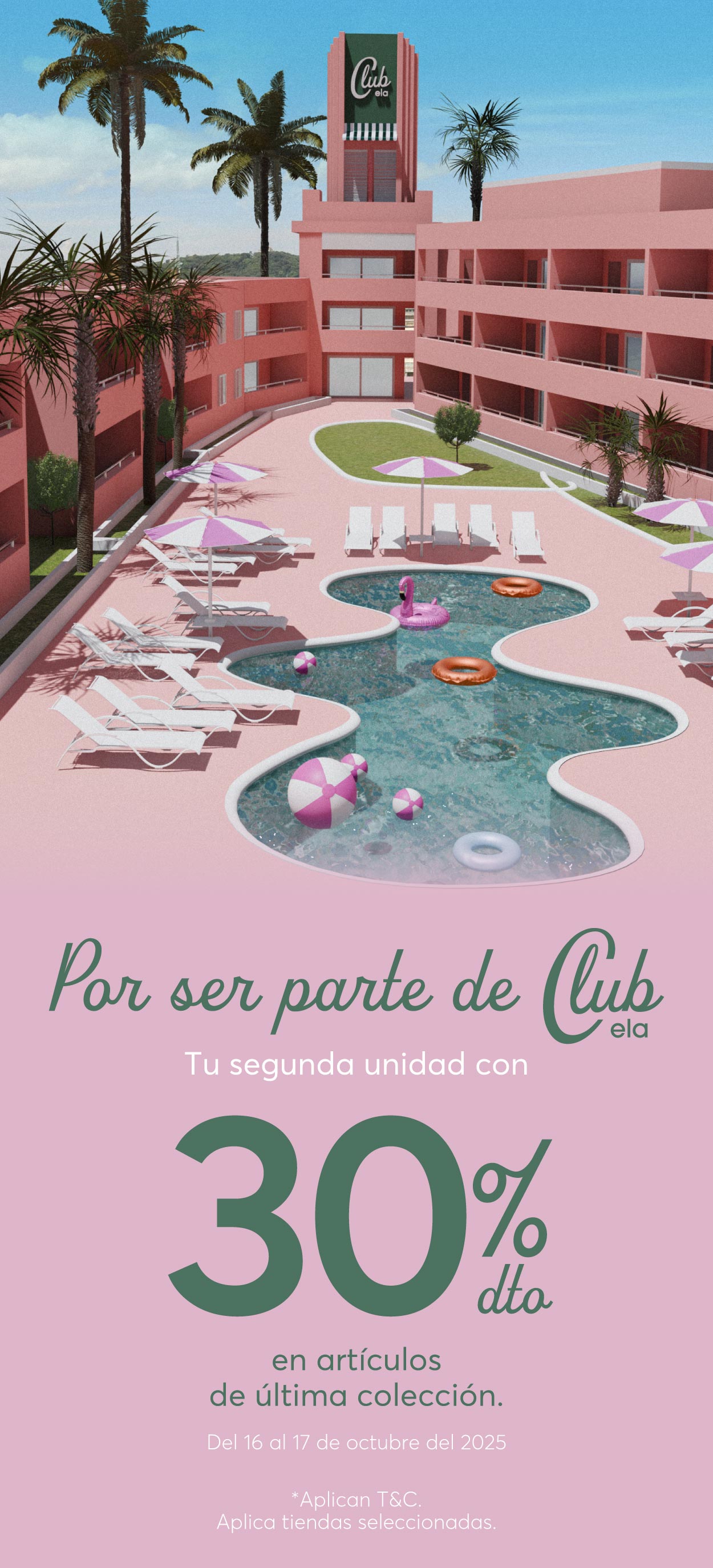 Si recibes esta comunicación por correo electrónico WhatsApp, Facebook e Instagram, entre el 16 y 17 de octubre de 2025, eres miembro activo del programa de beneficios Club ela y te encuentras ubicado en las ciudades de Barranquilla, Cartagena, Riohacha, Santa Marta, Soledad y Valledupar, recibe 30% de descuento por compras de dos o más artículos de nueva colección. Aplica para prendas de la última colección. No aplica para prendas marcadas con etiquetas de básicos. No aplica para redención de Merchand. El descuento es válido del 16 al 17 de octubre de 2025. Para acceder al beneficio, es indispensable haber realizado previamente la inscripción a través de https://fidelizacion.studiof.com.co/Ela/Home/CheckClientRegister . Para obtener el descuento en tiendas físicas debes presentar tu cédula de ciudadanía que te acredita como miembro del club y seleccionado especial de esta promoción. Aplica únicamente para tiendas ela de línea y mix ubicadas en las ciudades de Barranquilla, Cartagena, Riohacha, Santa Marta, Soledad y Valledupar. No aplica para tiendas ela Outlet y no es acumulable con otras promociones, bonos y/o descuentos. No aplica en tiendas ela ubicadas dentro de Falabella. El descuento no aplica para cambios ni para compras de Gift Card, igualmente no es acumulable con otros beneficios otorgados a los miembros del programa de beneficios club ela. No aplica para separar, facturar y/o comprar artículos en la modalidad “separación de mercancía”. Para más información, comunícate con el área de Servicio al Cliente de STF Group S.A. en Colombia al (602) 489 3192, por WhatsApp al +57 311 343 8656, o radica tu PQRS en https://www.ela.com.co/pqrs.
