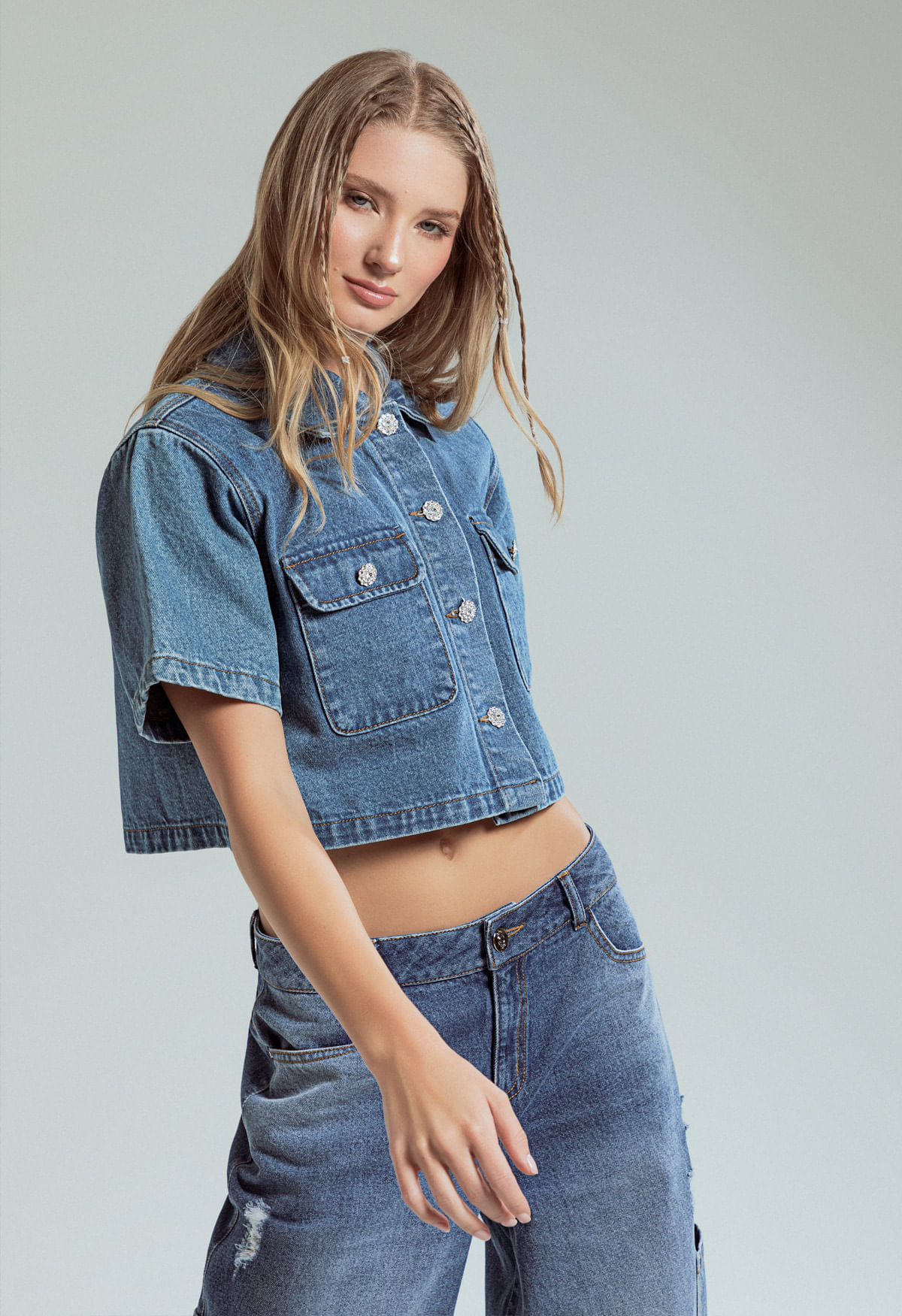 Blusa manga corta en denim para mujer l azulmedio - Imagen 1