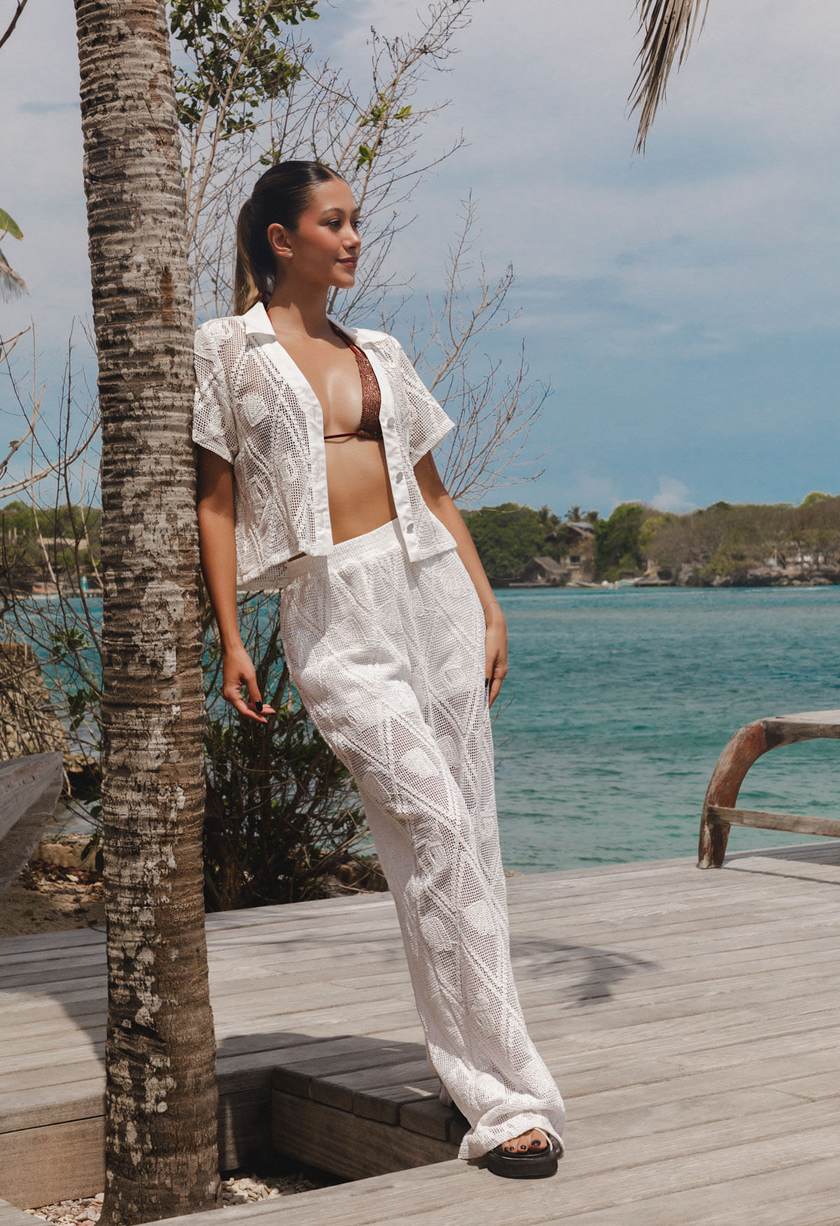 Pantalon palazzo tiro alto con pretina ruchada para mujer